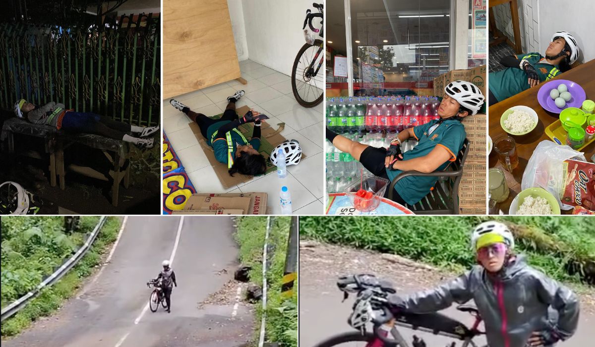 Ivo Ananda istirahat tidur di pinggir jalan saat mengikuti event ultra cycling, Mainsepeda East Java Journey 2026.–