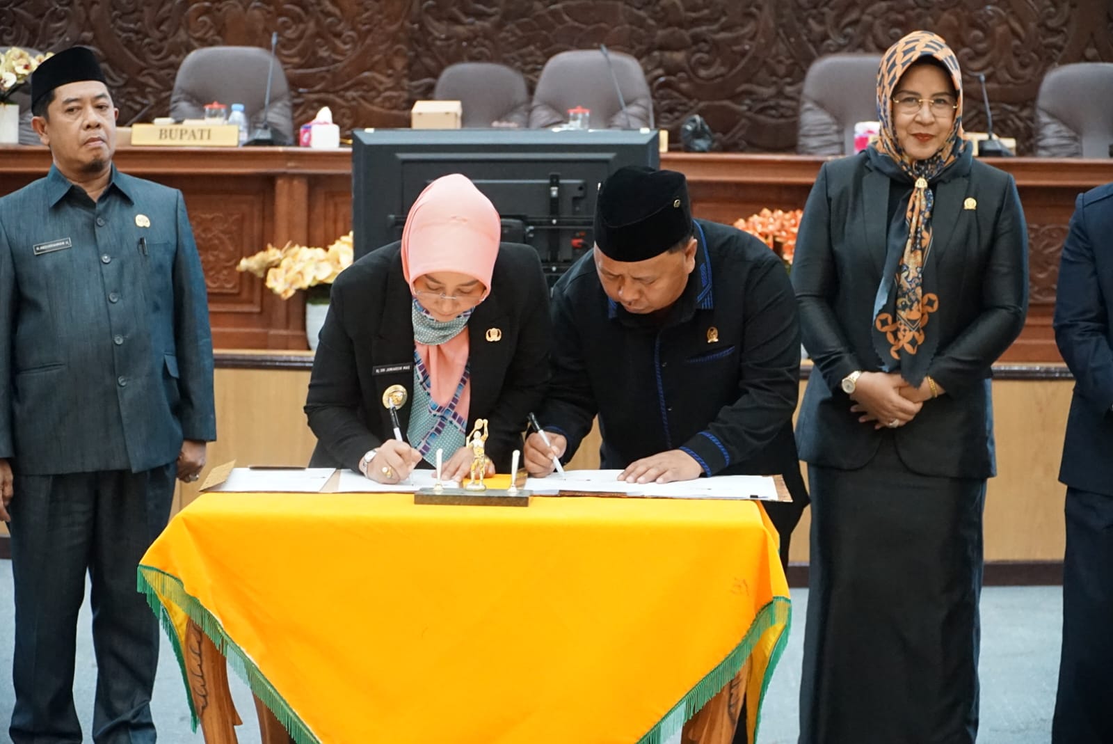 PERSETUJUAN bersama Raperda APBD 2024 diteken Bupati Berau Sri Juniarsih dan Ketua DPRD Berau Madri Pani, dalam rapat paripurna pada Selasa (7/11/2023).
