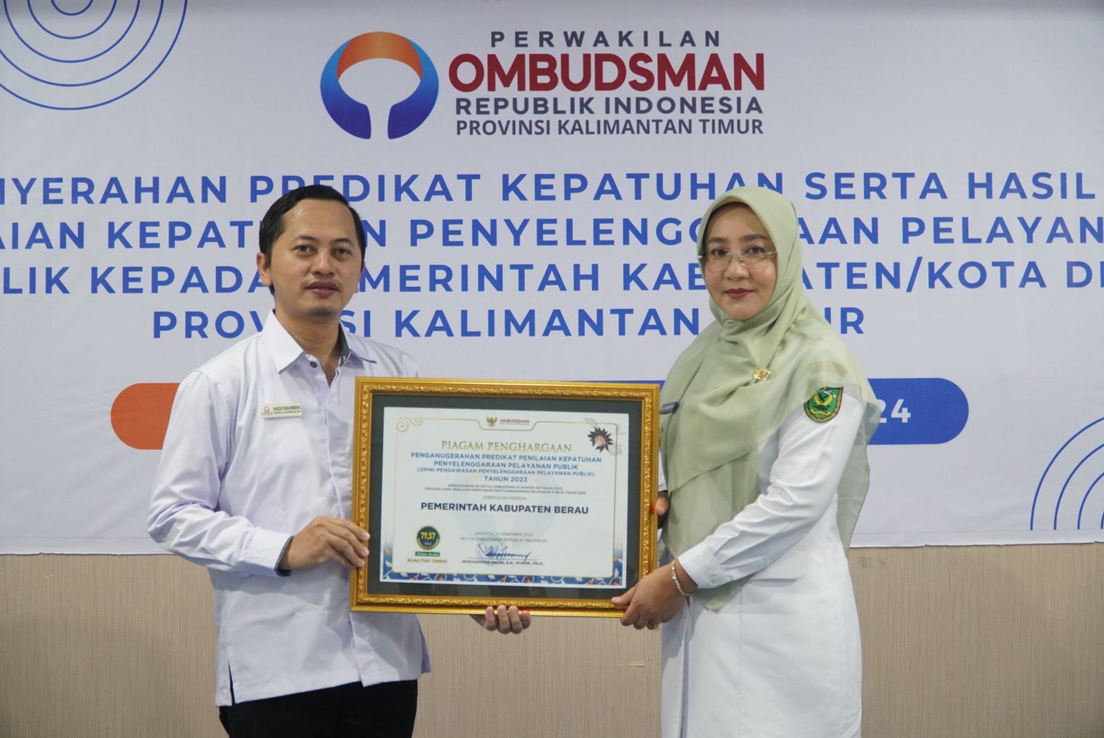 Atas capaian ini, Bupati Berau, Sri Juniarsih Mas, menerima piagam penghargaan opini pengawasan penyelenggaraan pelayanan publik tahun 2023 dari Ombudsman Republik Indonesia (ORI). Penghargaan diserahkan Pjs Kepala Perwakilan Ombudsman RI Provinsi Kalimantan Timur, Hadi Rahman, di Balikpapan, Rabu (31/1/2023).