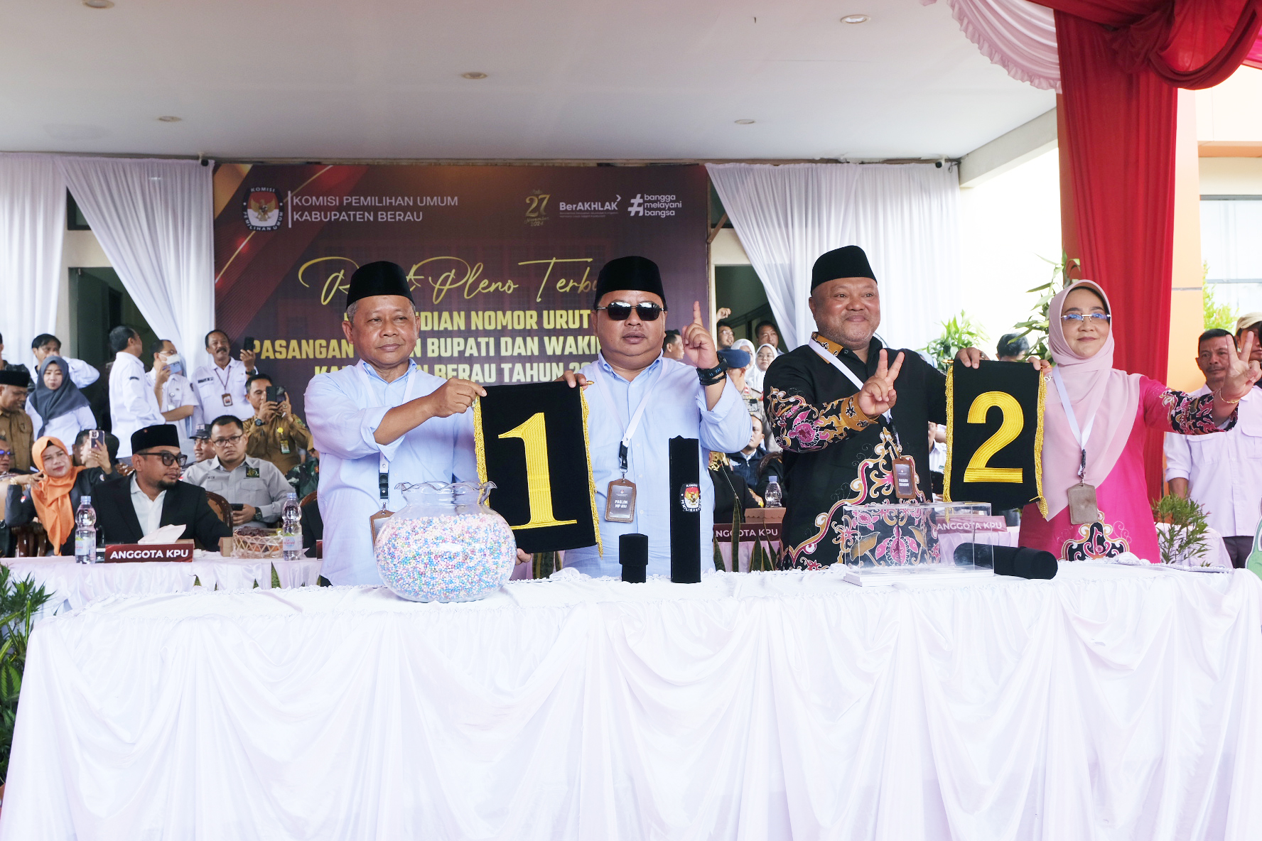 NOMOR urut Pasangan Calon (paslon) bupati dan wakil bupati Berau di Pemilihan Kepala Daerah (Pilkada) 2024 sudah resmi ditetapkan, pasangan Madri Pani-Agus Wahyudi mendapatkan nomor urut 1 dan pasangan Sri Juniarsih-Gamalis mendapat nomor urut 2.