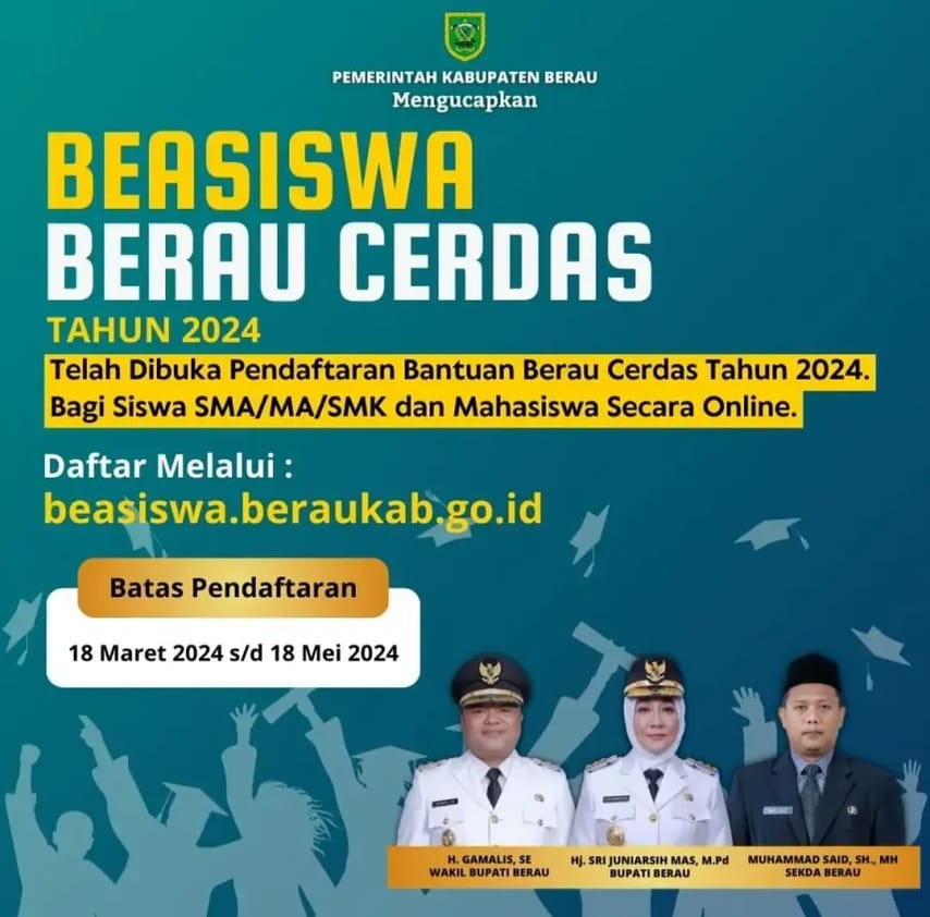 PEMERINTAH Kabupaten (Pemkab) Berau kembali membuka pendaftaran Beasiswa Berau Cerdas 2024.