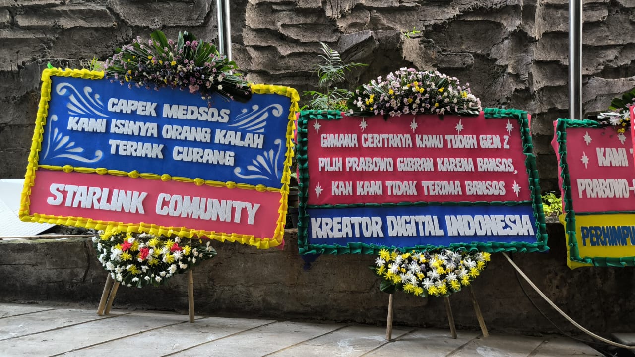 “Gimana ceritanya kamu tuduh generasi Z pilih Prabowo-Gibran karena bansos, kan kami tidak terima bansos,” tulis karangan bunga tersebut.