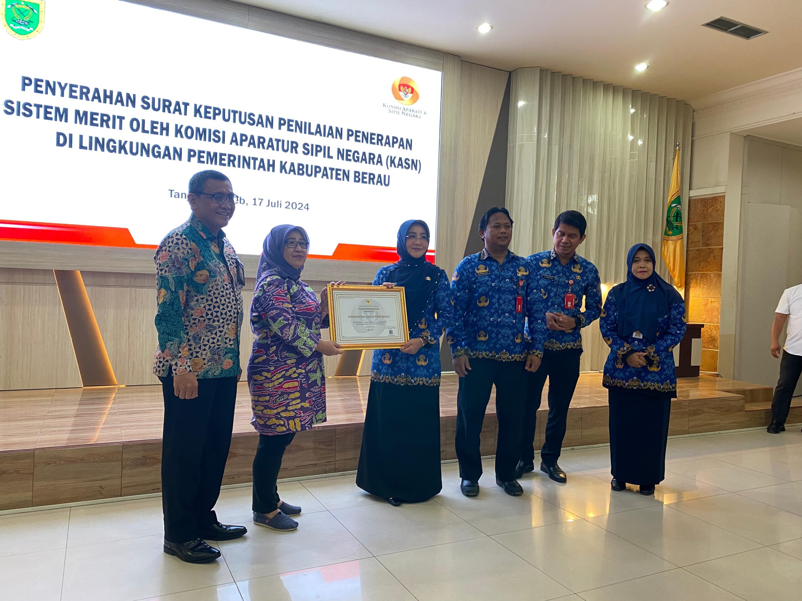 KOMISI Aparatur Sipil Negara (KASN) menyerahkan Surat Keputusan (SK) Penilaian Penerapan Sistem Merit kepada Pemerintah Kabupaten (Pemkab) Berau di Gedung Balai Mufakat, pada Rabu (17/7/2024).