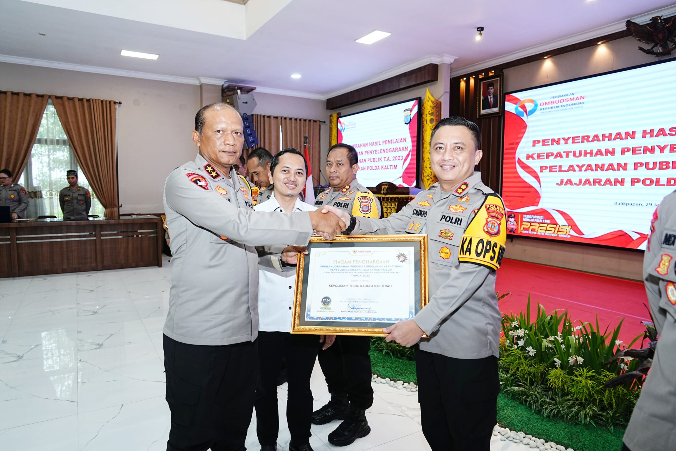 POLRES Berau berhasil meraih penghargaan dari Ombudsman Republik Indonesia atas Penilaian Kepatuhan Penyelenggaraan Pelayanan Publik Tahun 2023. Sebagai informasi, ini merupakan penghargaan pertama yang diperoleh Polres Berau pada 2024