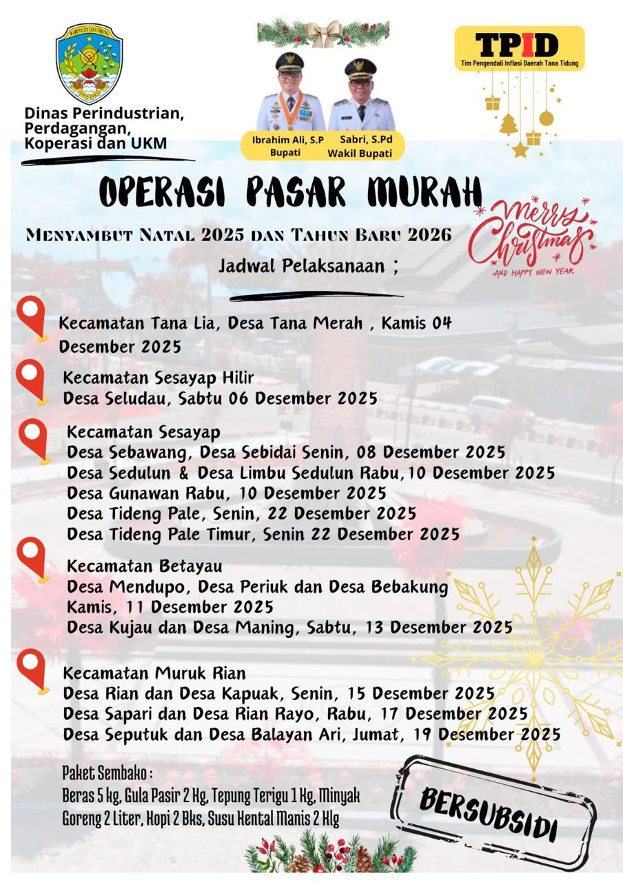 PEMERINTAH Kabupaten Tana Tidung kembali melaksanakan operasi pasar murah, sebagai upaya membantu masyarakat memenuhi kebutuhan pokok menjelang perayaan Natal 2025 dan Tahun Baru 2026.
