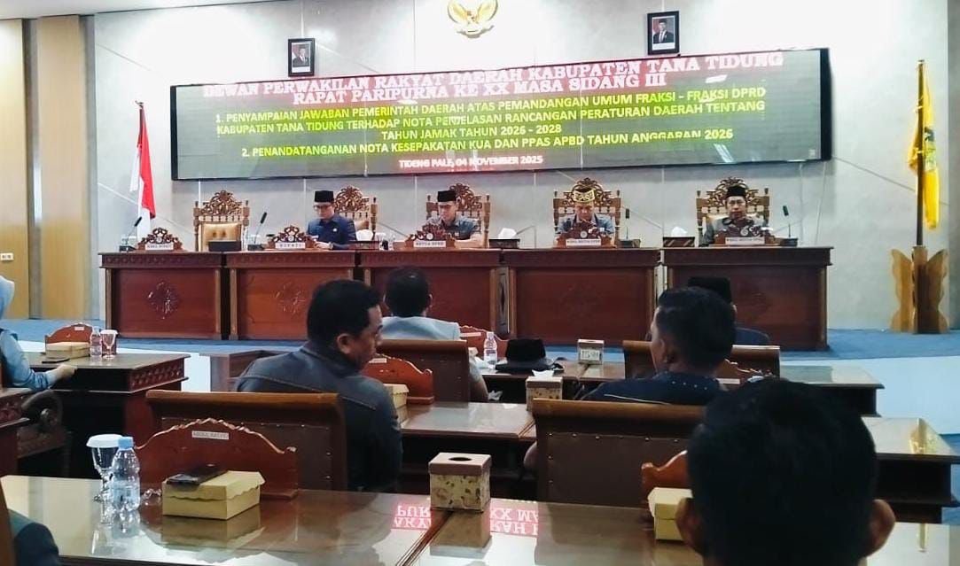 RAPAT Paripurna ke-XX Masa Sidang III Tahun 2025 di ruang sidang DPRD Kabupaten Tana Tidung, belum lama ini, menjadi salah satu rangkaian penting dalam proses penganggaran daerah.