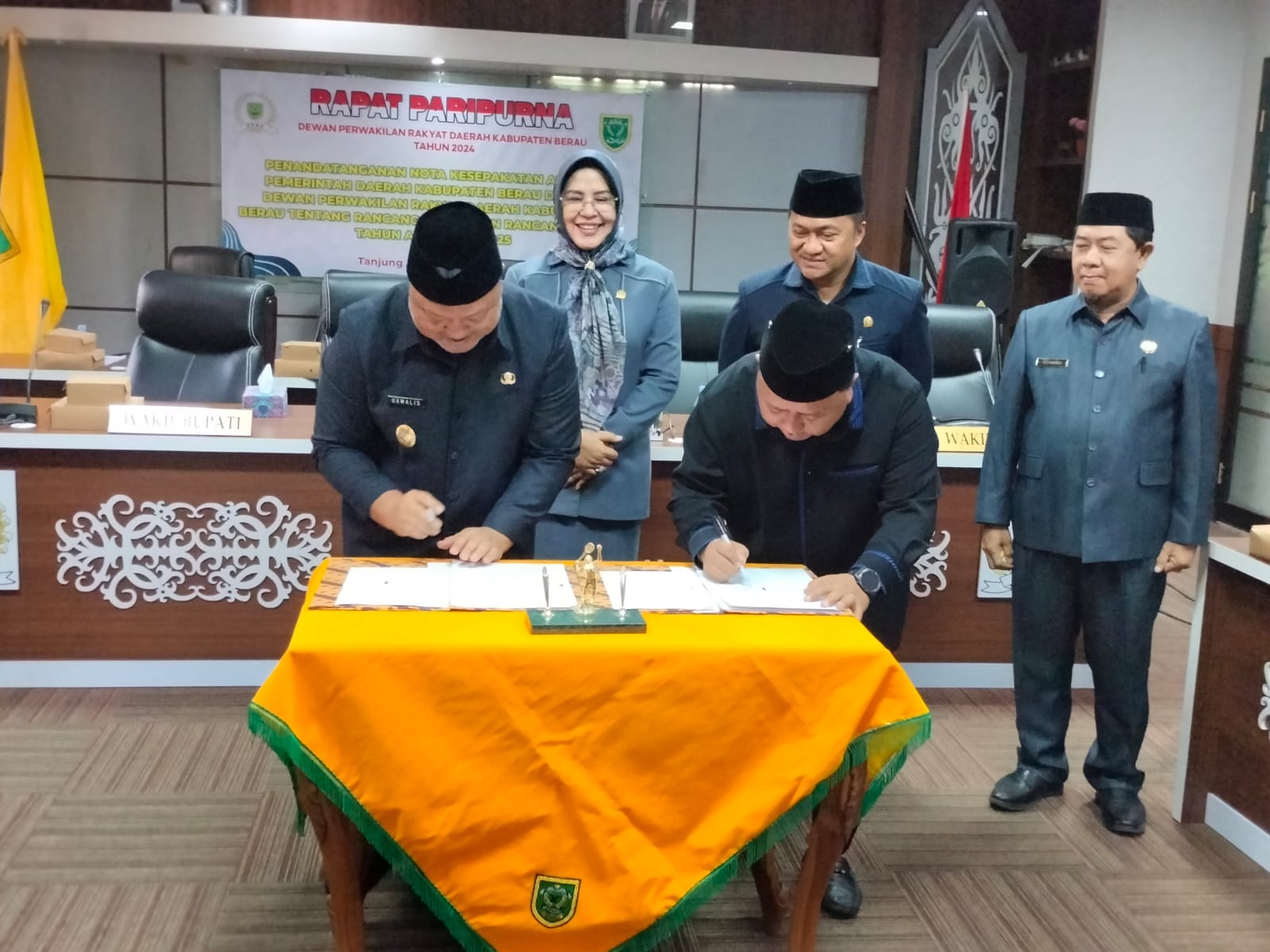 DEWAN Perwakilan Rakyat Daerah (DPRD) Berau, bersama Pemerintah Kabupaten (Pemkab) Berau, melakukan Penandatanganan nota kesepakatan tentang Rancangan Kebijakan Umum Anggaran (KUA) dan Prioritas Plafon Anggaran Sementara (PPAS) tahun anggaran 2025 di Ruang Rapat Gabungan DPRD Berau, pada Rabu (31/7/2024).