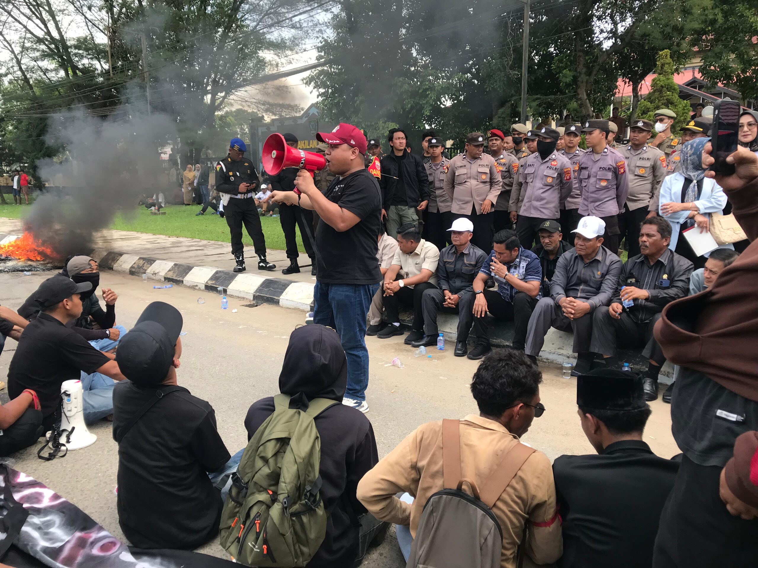 Aksi yang berlangsung sejak pagi sempat memanas ketika demonstran membakar ban bekas di halaman kantor DPRD. Namun, suasana mulai kondusif saat jajaran pimpinan dewan keluar dari ruang sidang untuk berdialog langsung dengan massa.