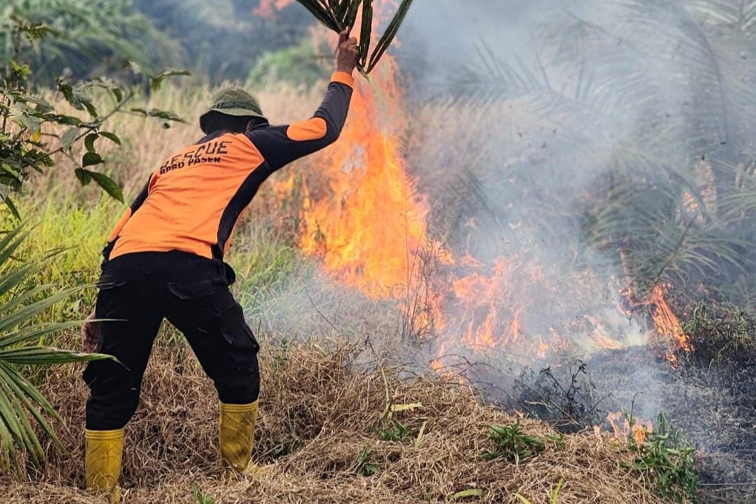 Petugas memadamkan semak belukar yang terbakar akibat cuaca ekstrem. BMKG melansir titik panas atau hot spot di Kaltim terus menurun.
