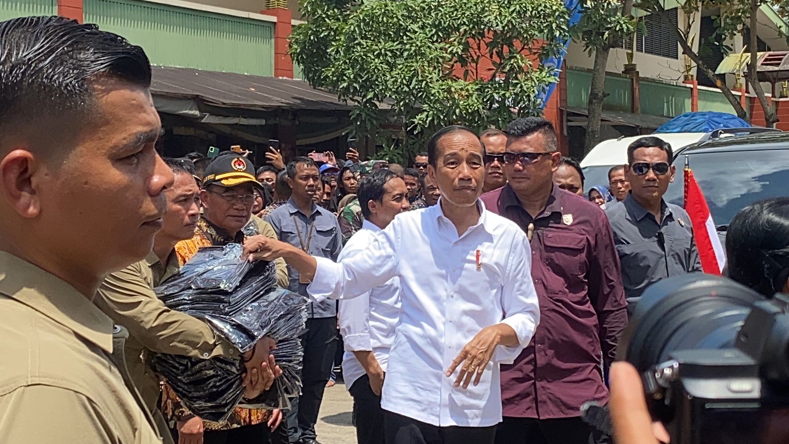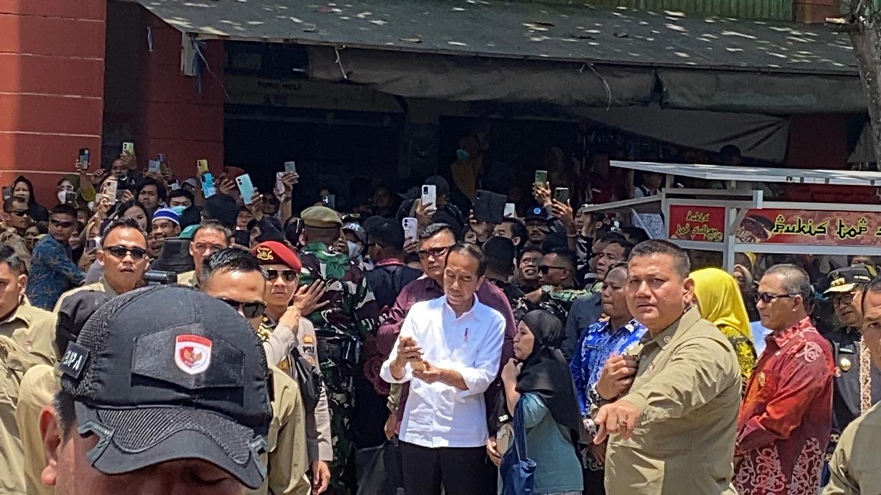 Kedatangan presiden langsung disambut dengan kerumunan masyarakat yang ingin bersalaman dan berfoto bersama.